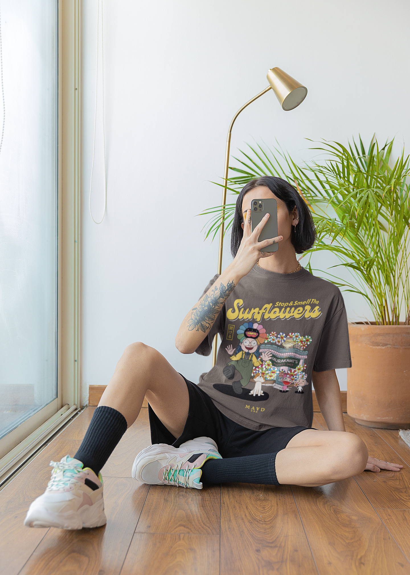 Description: Takashi Murakami's Flower Shop. Inspired by Takashi Murakami's iconic smiling flowers. This design encourages you to pause and appreciate the beauty in everyday moments. Momo’s trippin’ through Murakami land with a bouquet of good vibes and a reminder to pause and appreciate the art in everyday life. Drip meets depth with this culture-bending piece. Bright, playful, and spiritually woke.
