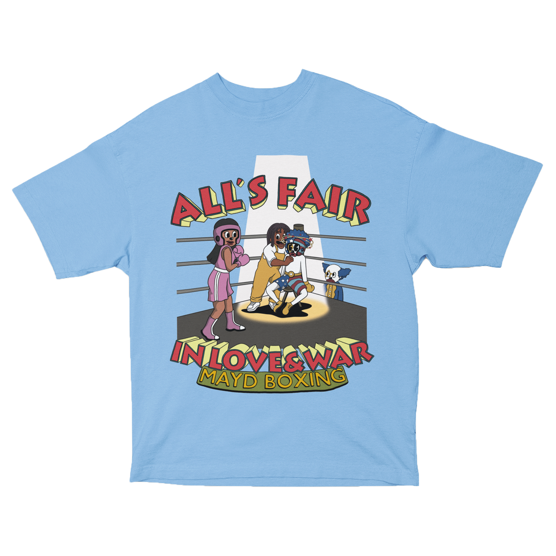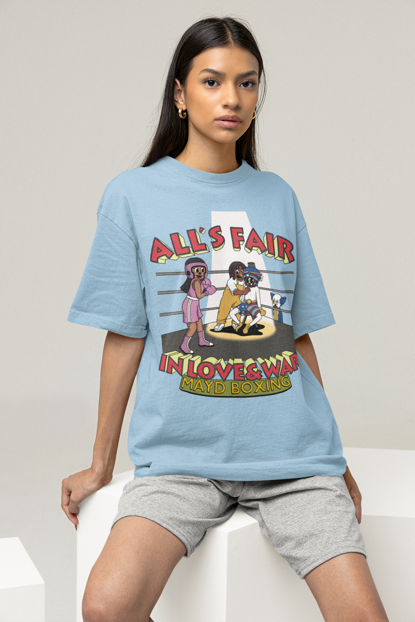 Description: This bold graphic tee from MAYD in America is more than streetwear—it’s a statement. Featuring Momo and the crew in a cartoon boxing showdown, “All’s Fair in Love & War” reminds us that hustle, heart, and dreams all come with gloves on. Inspired by underdogs and dreamers, this limited edition design hits hard with retro style, premium cotton, and that unapologetic MA¥D energy.