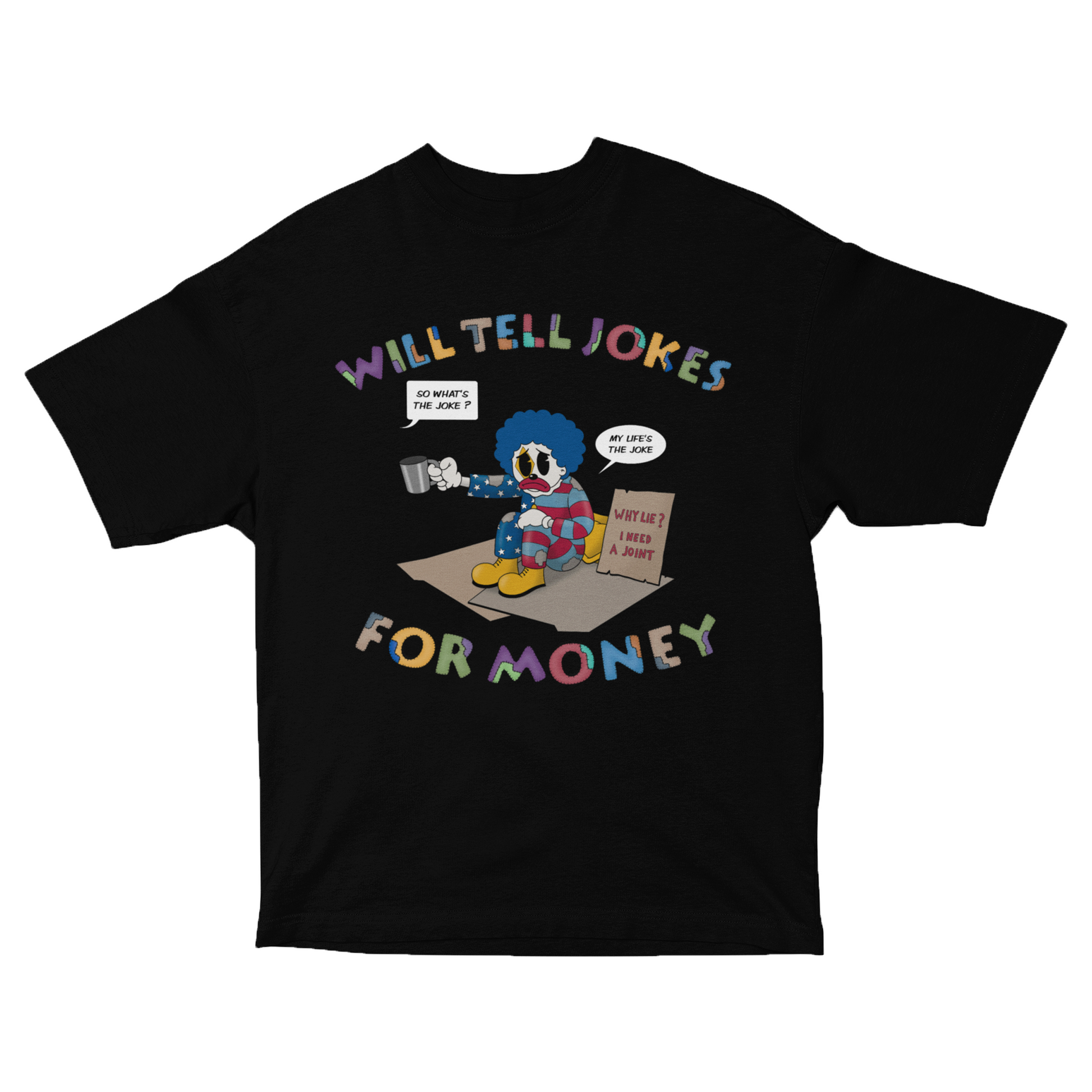 This bold graphic tee features our underdog clown posted on a cardboard mat with nothing but a coffee cup, broken dreams, and a sign that reads: “Why lie? I need a joint.” Dark humor meets high-quality streetwear in this limited edition heat-press tee.