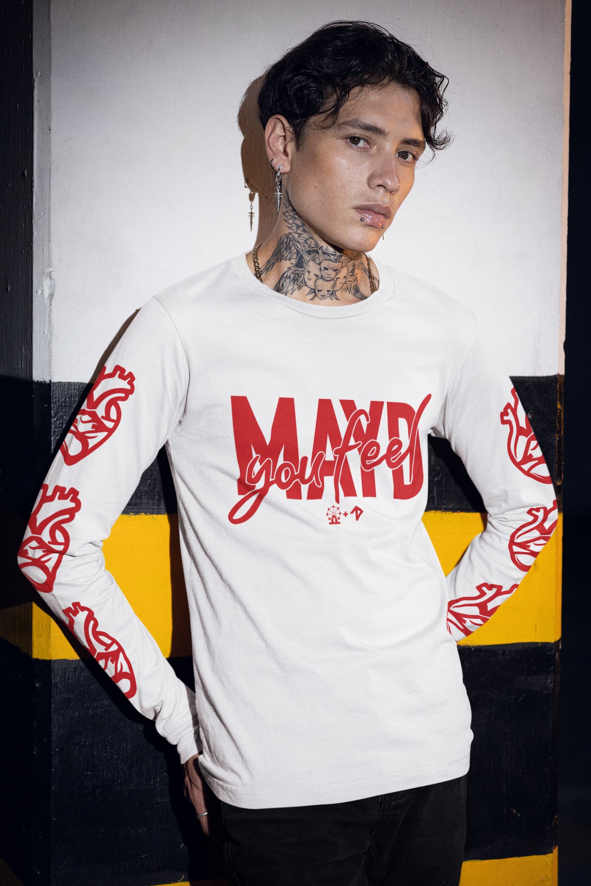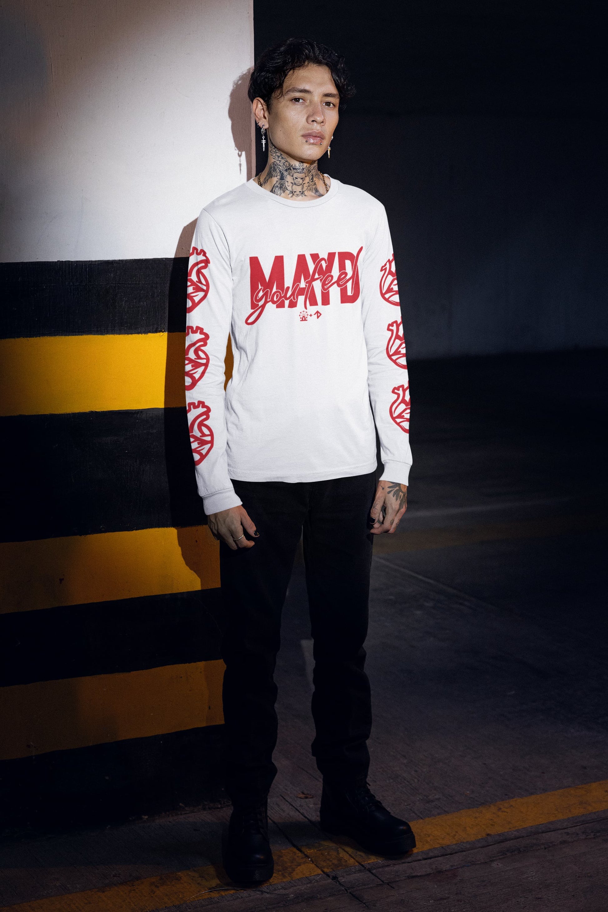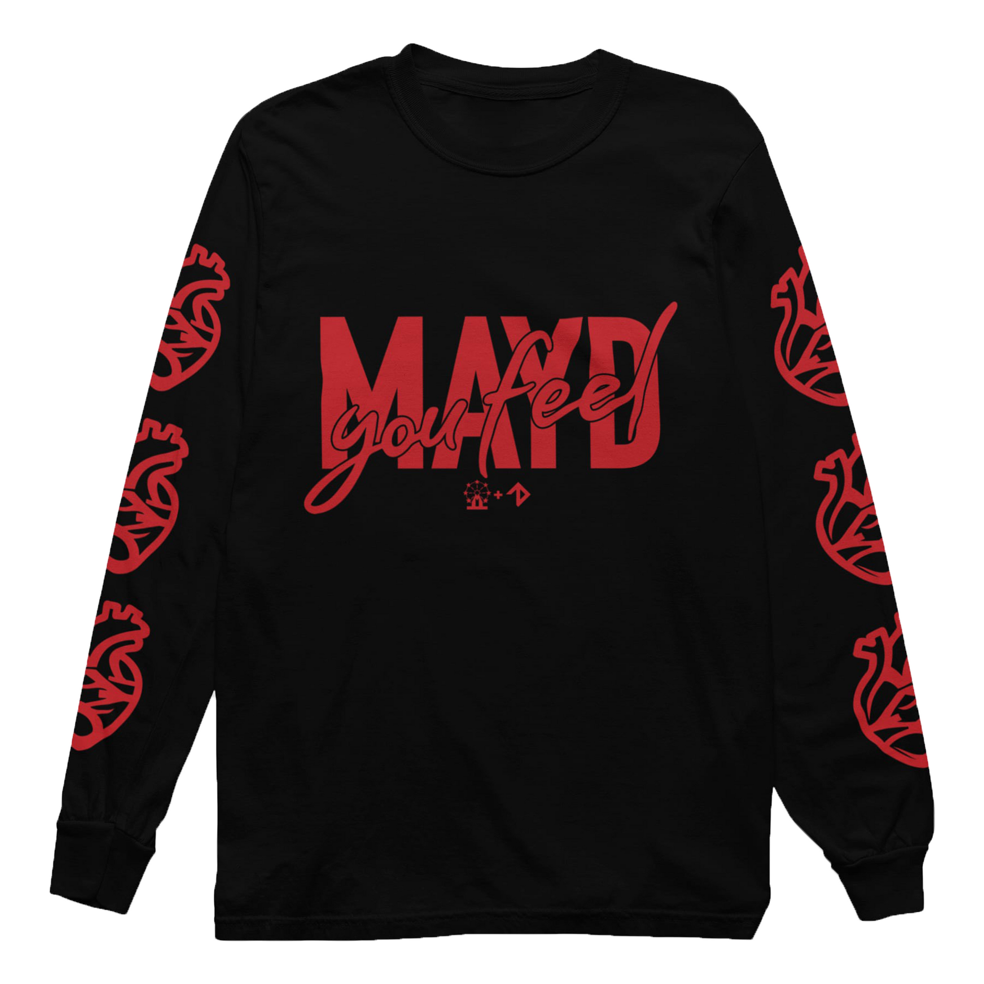 Description: MAYD in America has teamed up with Hunchback Graphics to bring you our official Valentine's Day long-sleeve T-shirt. Experience the power of love with our collaboration featuring artwork by Travis Duda. Love loud, dream bold. This limited-edition long sleeve is a special collab between MAYD in America and Hunchback Graphics, featuring custom art by Travis Duda. Red anatomical hearts down each sleeve. “You Feel” on the chest. Heavy on feeling. Heavy on weight. Drop certified.